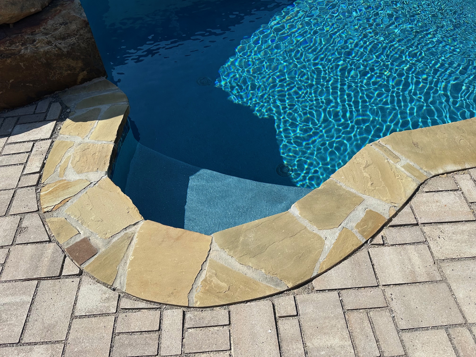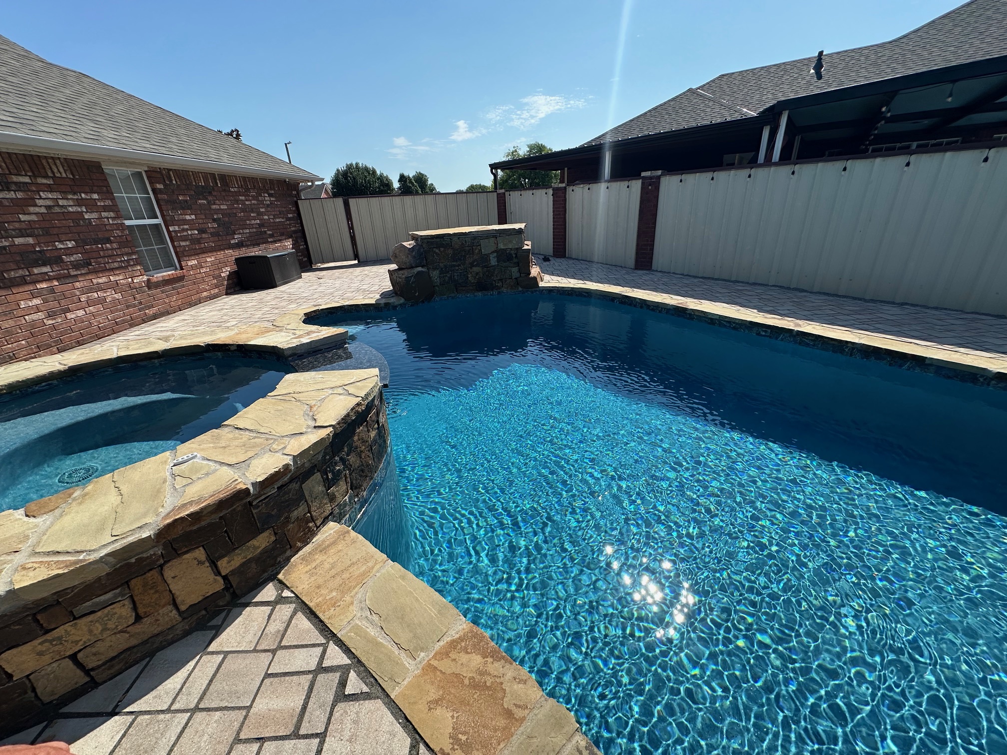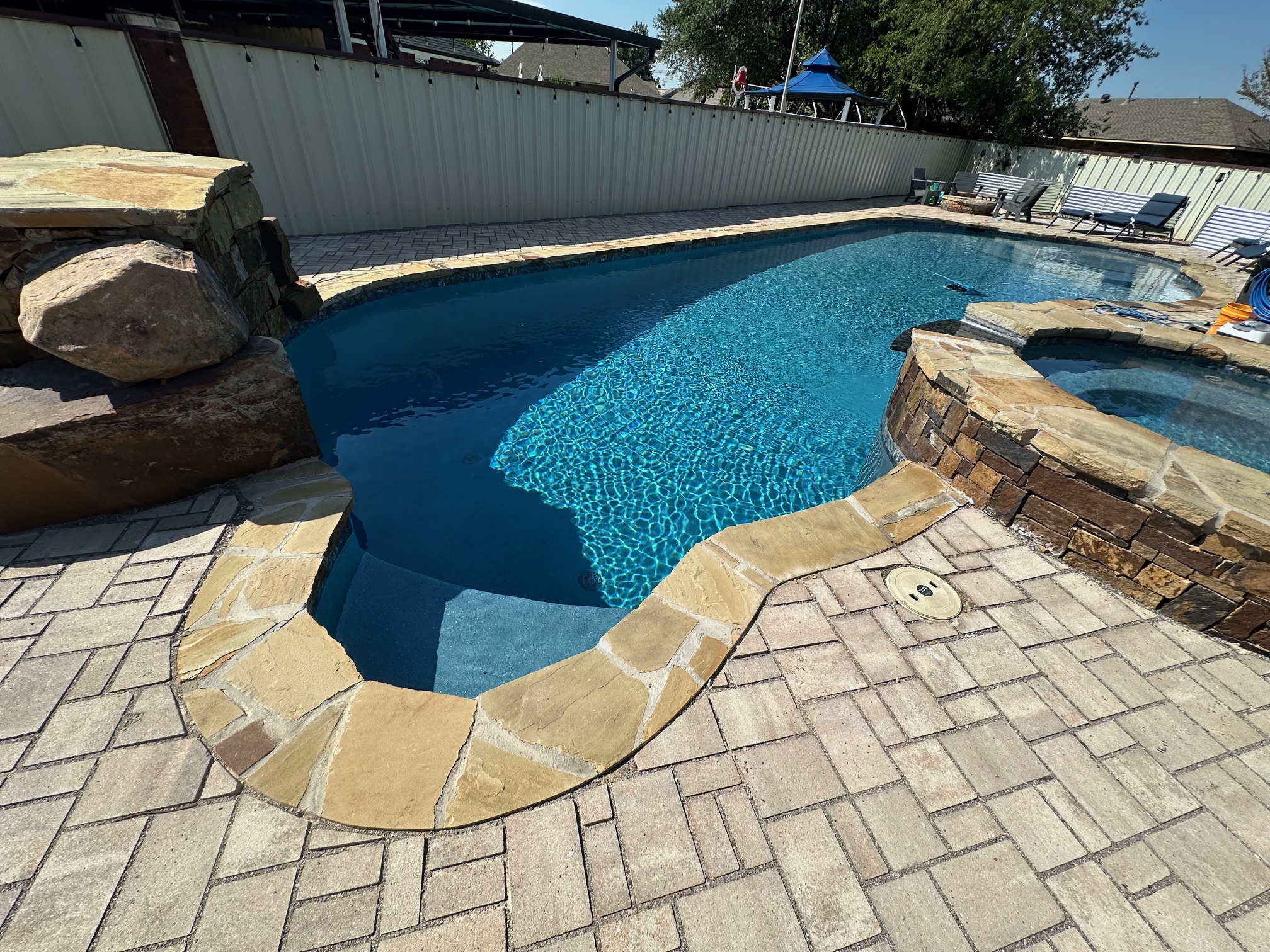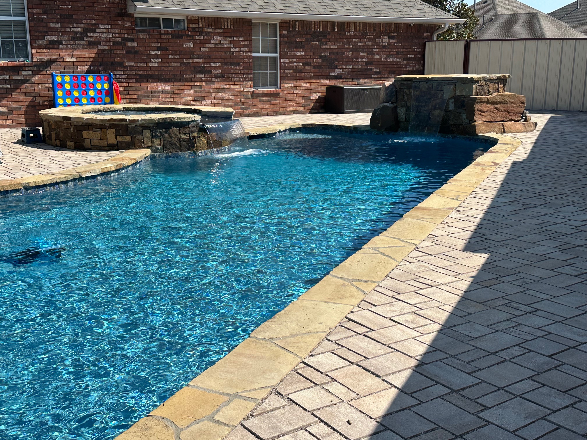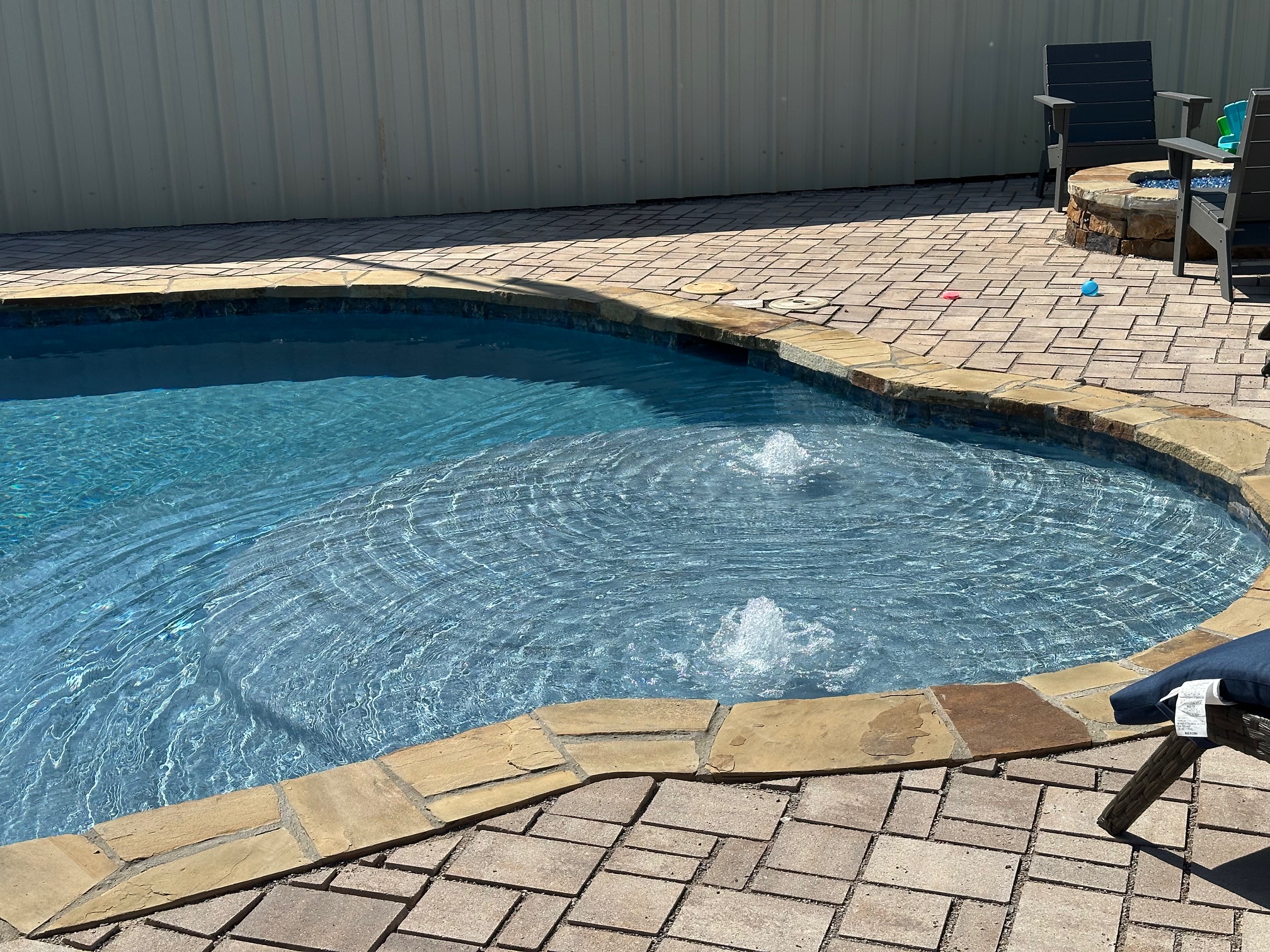 Custom concrete pool & spa with waterfall, tanning ledge, ramp to 3' depth, flagstone coping, permeable pavers and a firepit.