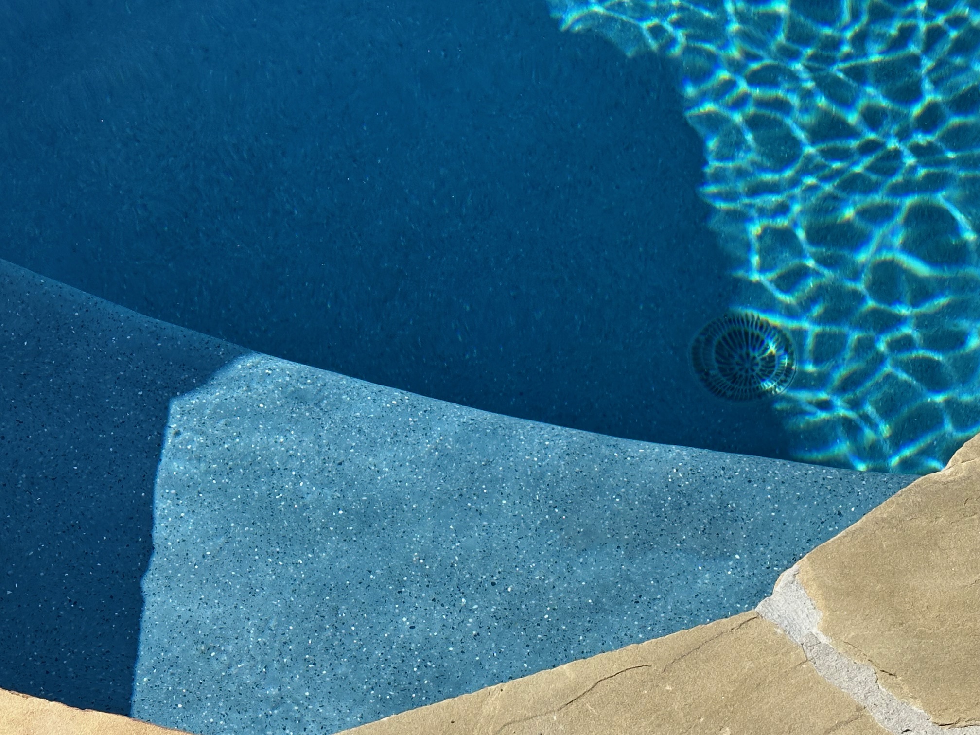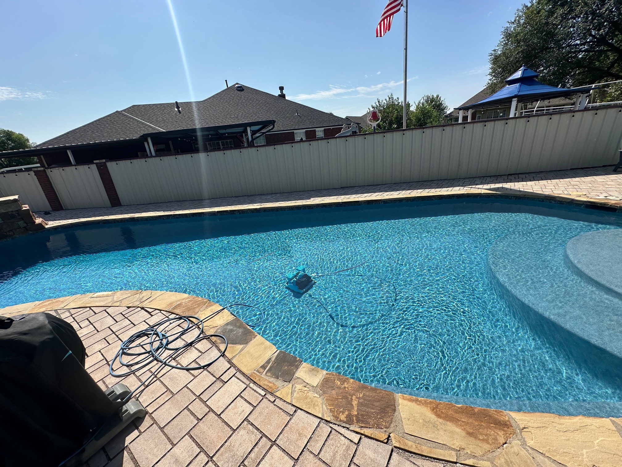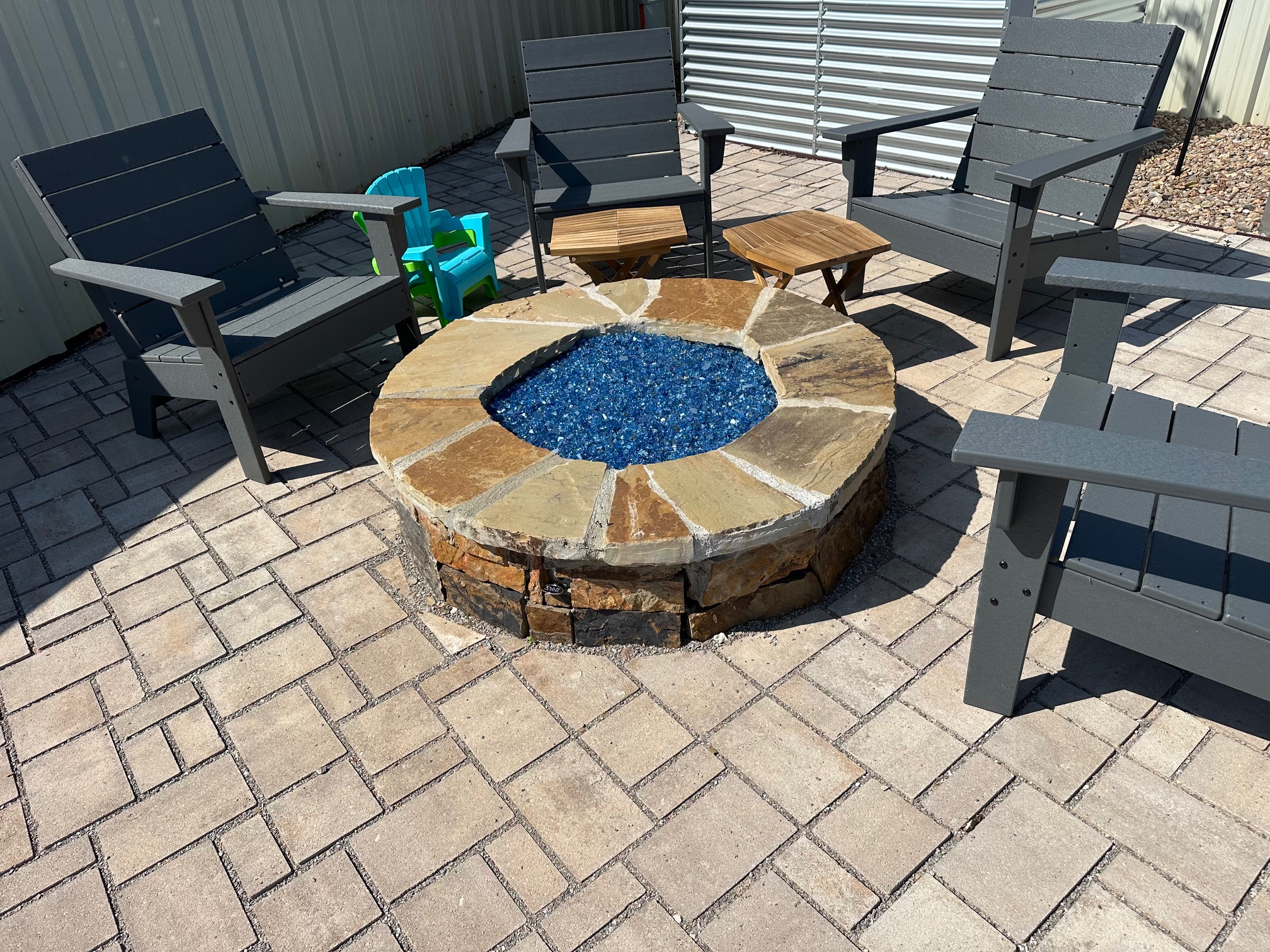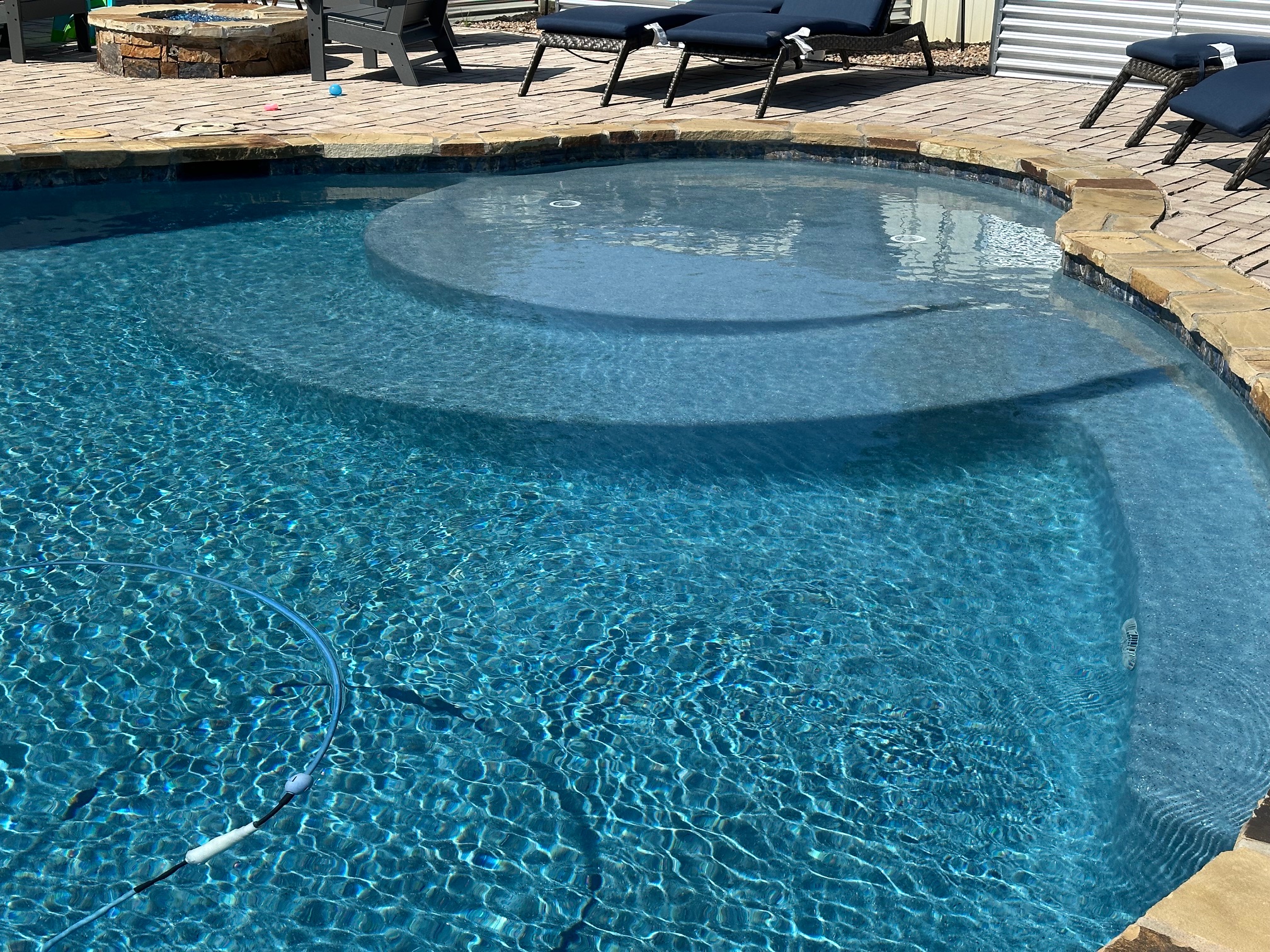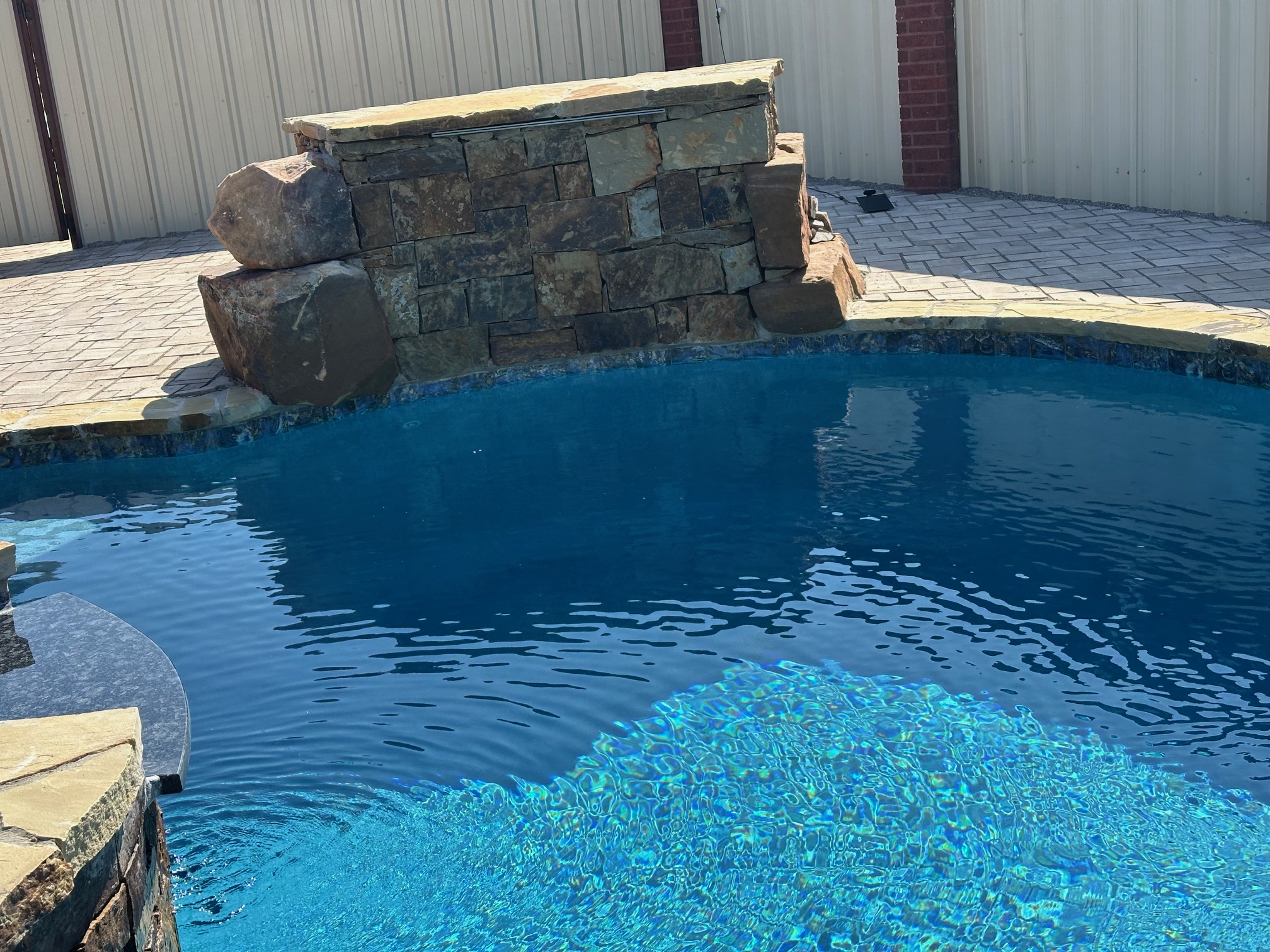 Custom concrete pool & spa with waterfall, tanning ledge, ramp to 3' depth, flagstone coping, permeable pavers and a firepit.